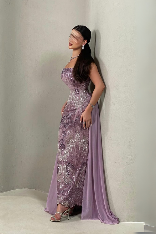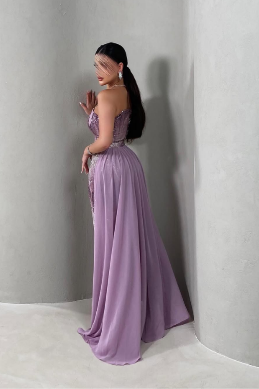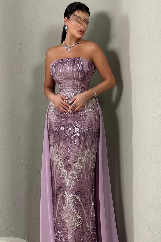 لإطلالة تجمع بين البريق الساحر والنعومة، نقدم لكِ هذا الفستان الفاخر بلونه الليلكي (اللافندر) الداكن.
