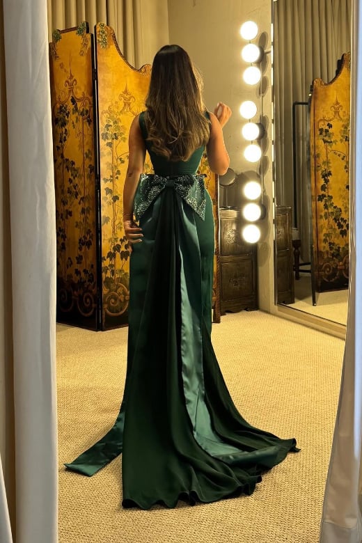 فستان سهرة بتطريز فاخر وفيونكة خلفية - موديل حضور ملكي