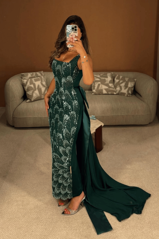 الفستان مغطى بالكامل بتطريز يدوي متقن بالخرز والترتر على شكل حراشف متلألئة، مما يمنحه بريقاً وفخامة استثنائية.