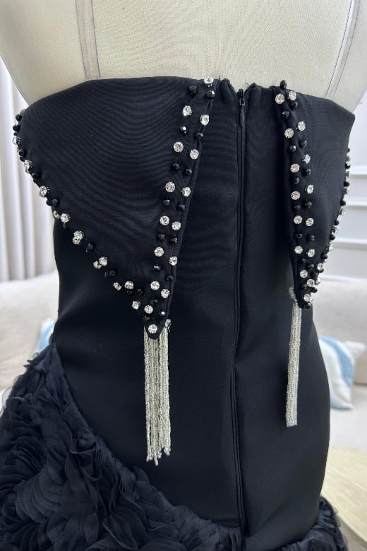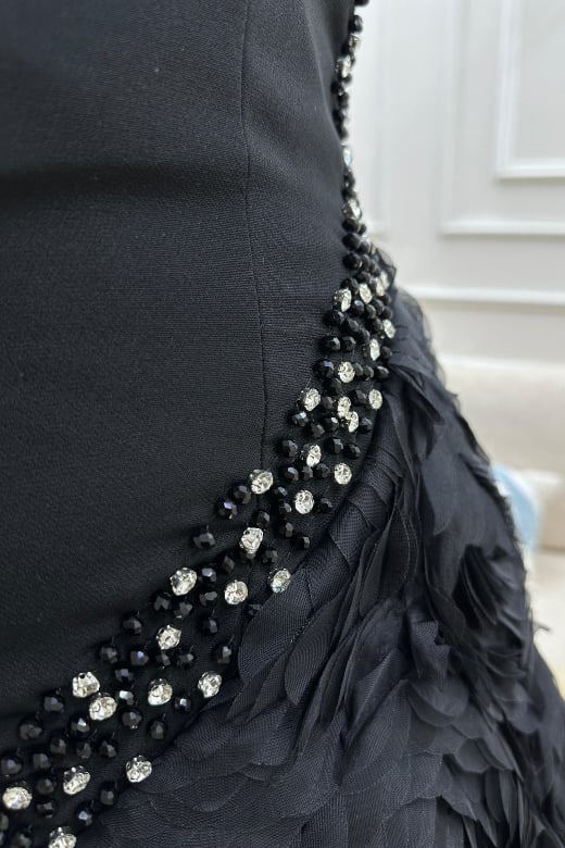 فستان سهرة أسود بتصميم درامي وتطريز كريستال - موديل فخامة الليل