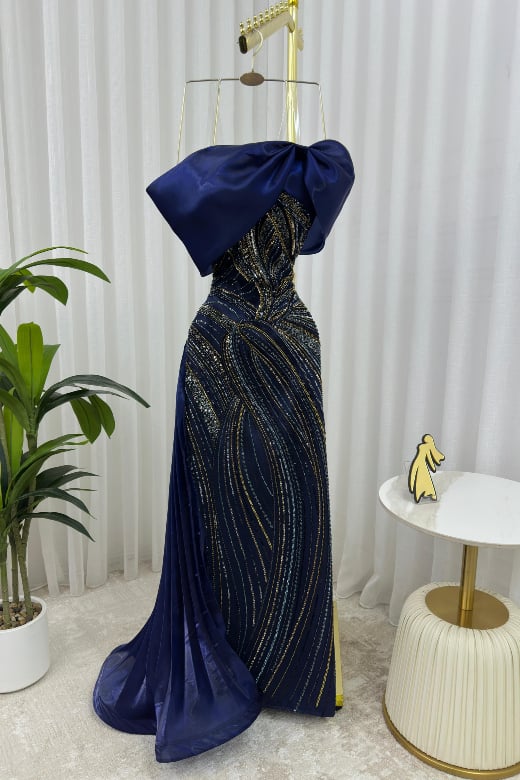 يتميز الفستان بتصميمه غير المتماثل بكتف واحد، حيث يزدان الكتف بقطعة ضخمة ومنحوتة من قماش الأورجنزا الفاخر، وتنسدل قطعة أخرى من الخصر لتضيف حجماً وحركة فنية للتصميم. الجزء العلوي من الفستان مزين بشك سهرة راقٍ يضيف لمسة من البريق الفاخر.