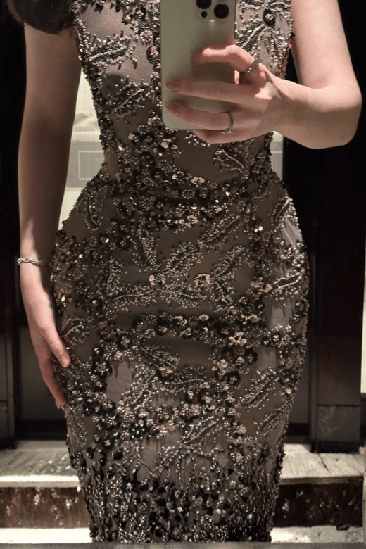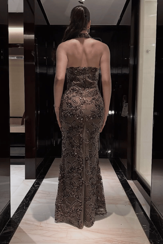 الفستان عبارة عن تحفة فنية، مغطى بالكامل بقماش مطرز بالخرز اللامع، ويأتي بقصة طويلة تبرز جمال القوام.